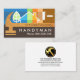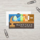 En trähammare avgränsar en övre landskapsplats mot en nedre brunt lagrar. I landskapet överst visas en hemscen som håller på att tas bort av en färgpensel. Färgen rand från penseln ändrar hela färgen som den går igenom. Scenen här kan representera vissa av de tjänster som du kan erbjuda, t.ex. att penseln kan representera målning, omformning, att ram kan användas för hemreparationer, att träd används för landskapsvård och att hammaren används för mattor. Varje bild lämnas till din egen personliga representation. Mot basen i mörken brunt lagrar ljuger jobbtiteln "HANDYMAN" som du kan ändra och den mobila kontakten. Inuti timmerhammaren har du ditt företag namn. På andra sidan, i ett vitt omslag, är guld hammarens logotyp som du kan använda överst. Detta följs av ditt prestigefyllda namn, kontaktuppgifter och ett slogantaggradsalternativ. Ett underbart kort för kreativ för alla till använda, särskilt för företag som arbetar med hemreparationer, handyman, inredingsdesign och byggnad.
