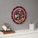 This is a decorative wall clock featuring the phrase "TIME FOR WINE" in large, three-dimensional light-colored letters on a deep maroon-red face. The bottom of the clock face is illustrated with bottles of red and white wine, several full wine glasses, clusters of purple grapes, and cheese wedges. The items rest on a depicted wooden surface. A beige, distressed ring separates the central image from the outer maroon rim. The design may look real due to the high detail and three-dimensional texture in the artwork.