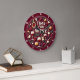 This is a colorful, decorative wall clock with a rich maroon background. The phrase "TIME FOR WINE" is centralized in large, three-dimensional light-colored letters. The entire clock face is densely decorated with flat illustrations of wine bottles, filled wine glasses, clusters of red and white grapes, and various cheese wedges. The items are scattered across the face with a light border separating them from the maroon outer rim. The design may look real due to the high detail and three-dimensional texture in the artwork.