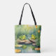 A tote bag with two little frogs relaxing on some rocks, they are thinking about doing some singing. The art is digital watercolors with a touch of cartooning in the frogs.
