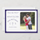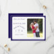 Elegant design features the photo you supply as main image displayed against a white background. Text is featured in a navy-blue font and displayed in the traditional format for a save-the-date card. Your brief message is displayed as an arch over the image of a cross. Initials of bride and groom appear on either side of cross. Entire design is framed with a navy-blue and white border.