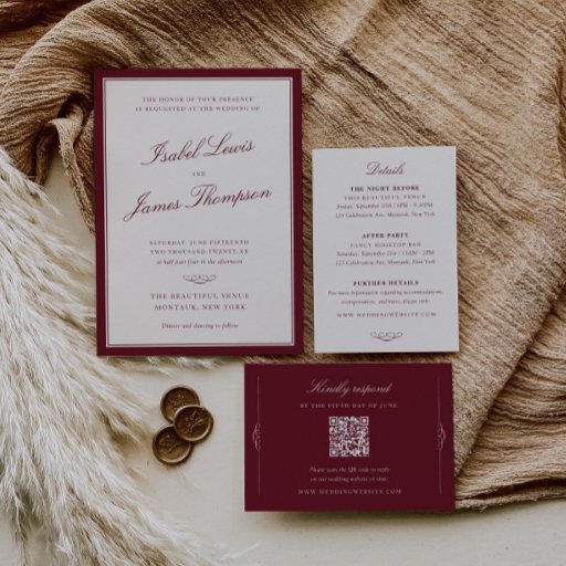 Featuring a maroon and ivory color scheme, it provides a rich and inviting look. Personalize the colors to perfectly match your wedding theme.