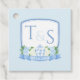 Den här elegantens blå och vita utformning har en handmålad botanisk par-vapensköld med initialer på båda partyn inuti. Den blå vapenskölden ram är dekorerad med blek blå och vit vattenfärgsblåa och mörkare grönt och med en blå och vit ingefära burk. Vattenfärgen inslag har av mig färgats på 100 procent papper bomull och skannats till digital form.