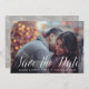 Ett elegant bröllop sparar det designade datumvykortet för att passa ditt favoritfoto för vågrät eller fullt-utfallsorienterad förlovning. "Spara datumet" visas i det vita, handskrivna kalligrafiskriptet med namn, datum och plats för bröllop under. Kort som går tillbaka till ett litet botaniskt mönster med utrymme för att inkludera webbplatsens URL för bröllop eller ytterligare information som du väljer. Du kan ändra färg genom att klicka på Anpassa/Anpassa och sedan välja ny bakgrund färg antingen från paletten eller genom att ange en färg hex-kod.