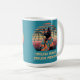 Timless Tropical Cat Attitude Coffee Mugg: En svart katt, med överdimensionerade solglasögon och en hawaiisk skjorta, som slår en coola med en tropisk solnedgång bakom sig.