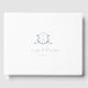 Elegant botaniskt adornerad vapensköld gäst bok i vintage bröllop i monogram i dammiga blått.