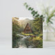 Ett lugnt tomt brevkort med ett naturtema från vildmarken. Illustrationen är en timmerstuga av a-typ ute i bergen och skogen med en hjort intill en porlande bäck.