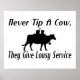 Ja, jag har haft många kor med mat och dryck och de komar aldrig tillbaka för att se om jag behöver något annat. Tippa aldrig en ko för att de gjorde ge förfärligt jobb! En ko med klocka på, som levererar mat och dryck på en bricka på ryggen.