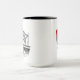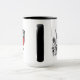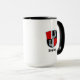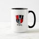 Mug with drawing of two German sailors of the famous German battleship Tirpitz of world war II and the coat of arms and the name of the ship written with fraktur letters.