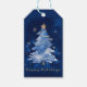 Add an elegant touch to your holiday gifts with this beautiful navy blue gift tag featuring a watercolor Christmas tree wrapped in golden ribbon and topped with a gold star, surrounded by delicate gold snowflakes. The back includes convenient “To:” and “From:” fields in matching gold text with a small gold snowflake accent. Perfect for adding refined, classy holiday style to presents for family, friends, or colleagues.