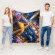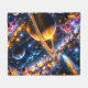 Journey to the stars from the comfort of your couch with this spectacular cosmic Odyssey plush throw blanket this high definition masterpiece features a ringed gas giant reminiscent of Saturn bathed in the golden glow of a distant sun. The entire scene is alive with a swirling kaleidoscope of Deep Purple and blue nebula fiery cosmic dust and a brilliant blue comment streaking across the galaxy. It's an immersive all over print that turns any room into a star gazing sanctuary made from ultrasoft premium fabric. This blanket is perfect for space