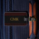 Bagagetaggen med träkornig ser fotobakgrund ut med monogram på ena sidan och namn och kontaktinformation på den andra.