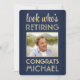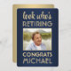 Se vem som går i pension! kolleger från inbjudan, medarbetare, familjemedlemmar och vänner till ett speciellt firande i pension med inbjudningar till elegant anpassningsbar-fotopartyn. Bild och alla formuleringar i den här mallen är enkla att anpassa. (IMAGE PLACEMENT TIP: Ett enkelt sätt att placera ett foto exakt på vilket sätt du vill är att lägga upp det i skörd innan du laddar upp det på Zazzles webbplats.) Den moderna marinblått- och guld-designen har ett foto av den pensionerade färgen, en mörk blått monbernbakgrund, faux guld-folie, snyggt-manusjus och klassisk vintage konsthantverk depografi. Observera att guld är tryckt på färg, inte metallfolie. Den könsneutrala utformningen är också lämplig för antingen en man eller en kvinna. Skål, Grattisar och Lycklig Pension!