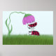 Ladybug klingar på en rosa blomma tittar ner på en annan nyckelbugg som står i gröntens gräs, med blå himmel överallt.