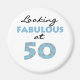 Svart och ljusblå text som lyder "Tittar Fabulous at 50" på Fabulous 50 T-shirts, mugg, munstycken, knappar och andra artiklar som gör underbara gåvor till den som blir 50 år gammal, och de kan bäras hela året!