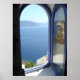 Tittar ut ett kyrkofönster i Santorini, Grekland