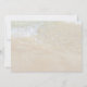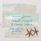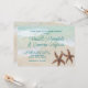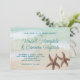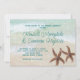 Två specialdesignade strandceremoni-inbjudningar för stjärnstjärna-bröllop på horisontella kort. Bild på havskanten med havsgrön text. Moderna typsnitt möjliggör fullständiga namn på bruden och brudgummen i handskriven stil - eller använd endast förnamn. Bruna sjöstjärnor längst ner representerar det strandälskande paret. Baksidan är en bild på hav och sand.