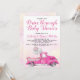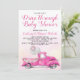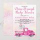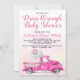 Drive through baby shower-inbjudan med söt rosa lastbil, ballonger och banner på en rosa och guld vattenfärg bakgrund. Denna drive through baby shower-inbjudan är lätt att anpassa för ditt evenemang genom att helt enkelt lägga till dina evenemangsuppgifter.