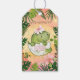 Lägg till en söt avslutande touch till era baby shower-favoriter med dessa charmiga personliga presenttaggar! Taggen har en vacker akvarellillustration av en liten dinosaurie som kläcks ur sitt ägg och nu bär en söt rosa rosett. Den fantasifulla scenen är placerad mot en fantastisk akvarellbakgrund med en tropisk solnedgång i varma orange och mjuka rosa toner, infattad i frodig grönska. Dessa taggar är perfekta att knyta fast på påsfavoriter, godislådor eller presenter och kan anpassas med den blivande mammans namn och datum för baby showern. De är en viktig del av er matchande "Flicka kan också ryta"-kollektion!