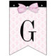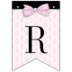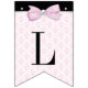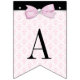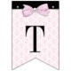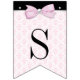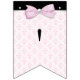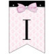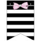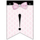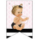 Svart randig baby shower-banner med söt ljushårig blond bebis som bär rufflade byxor och pärlor på en vacker rosa och vit damask och spetsbåge och svart randig bakgrund med Det är en tjej! Du kan välja typsnittsstil efter eget val på denna söta rosa och svarta baby shower-banner.