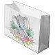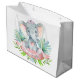 Tjej babypresentpåse med bedårande baby elefant tjej som bär en söt rosa rosett på en grön blad och rosa banderoll bakgrund. Denna elefant baby shower presentpåse kan enkelt anpassas med den text du väljer på banderollen. Du kan också lägga till en bakgrundsfärg.