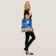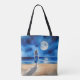 Tote Bag illustrerar en ensam ung kvinna i en blå klänning som står kant i en strand och som tittar på fullt och reflekterar över havet. Serennatten i himmel är full av stjärnor.