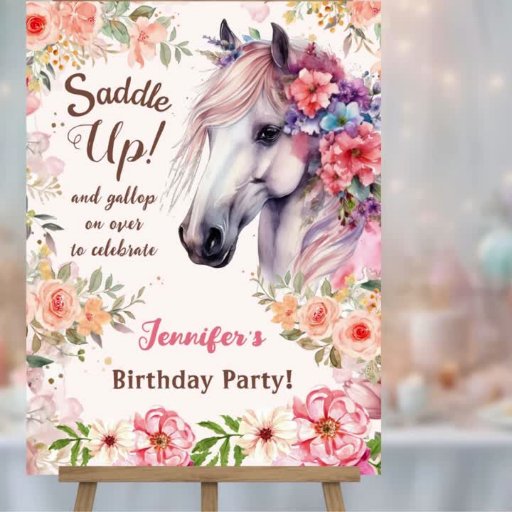Saddla med vår "Girls Horse 1st Birthday Rosa Flowers Saddle Up! 🎉 Kick från firande i stil med detta vackra cowgirl-tema! Ta bort din nu och låt ponny party börja! 🎉 🎂