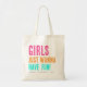 Rolig trendig tjejaktig Bachelorette-handväska. Designen har texten 'TJEJERNA BARA VILL HA KUL', brudens namn och år.
