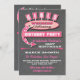 Tjejers helgutflykts-inbjudan Super söt och cool, dessa inbjudningar har en retro skylt som välkomnar dina vänner till en födelsedagsfest för helgen och baksidan innehåller alla detaljer om de roliga aktiviteterna. Svart tavla-bakgrund och rosa och rosafärgad palett. Handritad illustration av McBooboo