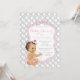 Pärla bebisfest inbjudan med söt liten bebisflicka som bär rosa rufflade byxor och en rad pärlor på en vacker tuffad pärla bakgrund med fin silver och rosa rosett bakgrund. Denna söta rosa och grå pärla bebisfest inbjudan är lätt att anpassa för ditt evenemang genom att helt enkelt lägga till dina detaljer i den teckensnittsstil och formulering du väljer. Detta är en tryckt design utan riktiga pärlor, tufting, glitter etc.