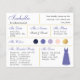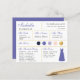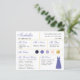 En brudtärningsinformationskort för ett lila och gult bröllop, inklusive information om bröllopsdatum och plats, bröllopets färger, brölloppsfesten, brudtärningsklänningen och ett meddelande om förfrågan om att bli brudtärning. Brudtärningens namn och titlarna är skrivna med en violett elegant skrift. I det nedre högra hörnet finns en violett klänning. I mitten finns brölloppsfärgerna i cirklar. Färgerna, inklusive färgen på brudklänningen, kan ändras, med undantag för den gyllene cirkeln, som är falsk guld folie. Standardfärgerna är marinblå, violett (lila), lavendel (ljuslila), rosafärgad och guld. Baksidan är lavendel, liksom brudt
