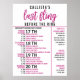 Den här söta och feminina möhippeplaneringpostern är perfekt för att hålla din fest organiserad och dina gäster informerade. Den har en modern och konstnärlig typsnitt i lila-rosa och svart på en enkel vit bakgrund. Det är en unik, cool och rolig idé för att göra din speciella dag ännu mer speciell, på rätt spår och strukturerad.