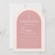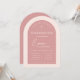 En modern välkomsthälsning för tjejkonfirmation i blush rosa och dammig rosafärg med en båge. I den övre delen finns ett kors med texten böjd ovanför. Förnamnet är skrivet i skrivstil, ovanför efternamnet. Informationen om ceremonin och mottagningen är på två kolumner åtskilda av en linje. Texten, linjerna och den yttre bågens färg är blush rosa, bakgrunden (insidan av bågen) och baksidan är dammig rosa, en modern rosa nyans