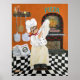 Originalfärgad design efter artist. Tjock liten kock som försöker köra en stor biet deg in i luft med alla kökstillbehör och pizzaugg i bakgrunden.