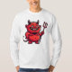 I den här bilden visas ett tecken av tjocken tecknad djävulen med rött skal, små svarta horn.
