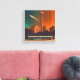 Split between warm orange dusk and deep teal night, the color palette reinforces the theme of duality: past and future, earth and sky, motion and stillness. Overhead, a rocket soars past a luminous moon, leaving brilliant contrails across a star-speckled sky, suggesting ambition without limit.