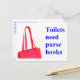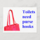 För många toaletter, permanenta eller bärbara, har inte krok. Var förväntar de sig att vi ska ställa jacka, plånböcker, tote bags, verktygsbälten, shopping bag etc.? Om det finns tillräckligt många ge eller skickar vykortet till chefer för byggnad, festivaler och campingplatser kan badrumskulturen växla. Kontrakt för hyrda portoer kan lätt kräva krok (en liten svag krok böjer inte plasten). Underhåll kan lägga till krok i permanenta vilorum. Detta är en feministisk fråga, och inte bara det. Alla har väskor och jackar. Mer information finns på http://toilet.ourwater.us