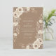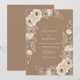 Denna design har en varm toffeebrun bakgrund prydd med mjuka akvarellrosor i nyanser av kräm och elfenben. Ömtåliga bladgrenar och botaniska element skapar en romantisk atmosfär som passar för höst eller skogsbröllop. Den jordnära paletten frammanar en organisk rustik charm, perfekt för en elegant landsbygdshändelse.