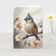 Tofsmes sittande på en trädgren omgiven av vackra vita blommor. Tom kort för födelsedag, årsdag, ny bebis, tack, kondoleans, etc.