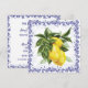 Den här charmiga, anpassningsbara inbjudan har en vacker europeisk design med saftiga mogna citroner omgivna av en toile-filigran kant i marinblått. En livfull samling citroner vilar i en gren med frodiga gröna blad och skapar en elegant och uppfriskande känsla. Personifiera baksidan för vilken fest eller sammankomst som helst – perfekt för citron-tema fester som bröllopsdusch, födelsedagar eller trädgårdsfester. Ett fräscht och underbart tillskott till din speciella tillställning!