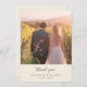 This is a romantic style image featuring a couple walking hand in hand through a vineyard during sunset. The warm golden hues of the setting sun bathe the scene, creating an enchanting and serene atmosphere. The bride's elegant gown and groom's classic suit add to the timeless charm. Perfect for expressing gratitude after a beautiful wedding day, this card captures the essence of love and celebration.