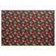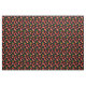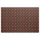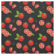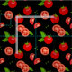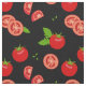 Röd och svart väv med saftiga röda tomater, tomatskivor och små löv av grönt.