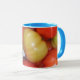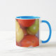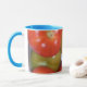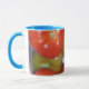 Ett vitt mugg med blå fälg och handtag, dekorerat med ett foto av mognadstomater