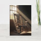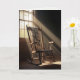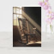 En trägungstol täckt med en rutig filt är belyst av mjukt solljus som strömmar genom ett fönster och kastar mjuka skuggor på golvet.