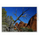Fotografi av tvinnad juniper träd mot sten-formationer av Arches nationalpark. Fotografi av Jon Sullivan.