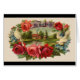 detta tomma hälsningkort för vintage har en avbilda av tre röd ros på bekläda med två duvor på sidan och lite ett hus i mittet