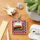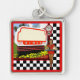 Stor, fyrkantig, förstklassig metall-nyckelkedja med en middag på 50 sekunder, röd middag och en 50-sekundersserver i vintage på en svart och vit kontrollpanel. Se matchande fyrkantig knapp. Visa hela femtiotalskedjans uppsättning i SPECIELLA TUUCHES | Avsnittet Party favors.