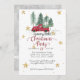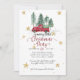"Tomtar Röd Farmfordon Glädjelig Liten Julfest Julkort." Akvarellillustration av en vintage röd farmfordon på tomtens trädgård med guldstjärnor och snöflingor inbjuder dig till en Glädjelig Liten Julfest! Ett par renar och en annan tomte finns på baksidan tillsammans med en mjuk grå bakgrund med fallande snöflingmönster. Konst av Audrey Jeanne Roberts, upphovsrätt.