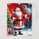 Tomten står med en lysande stav bredvid en färgglad julgran, omgiven av festliga presenter.