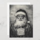 En hyperrealistisk, svart-vit skildring av Tomten i ett mugshot-scenario. Den detaljerade bilden visar Tomten i sin traditionella klädsel, men med ett slitit, oansenligt utseende, komplett med en skylt som hänger runt halsen. Bakom honom finns ett vintage-mätchart, som bidrar till den råa, dramatiska tonen. Denna okonventionella skildring ger en mystisk, rebellisk twist till den älskade julikonen.
